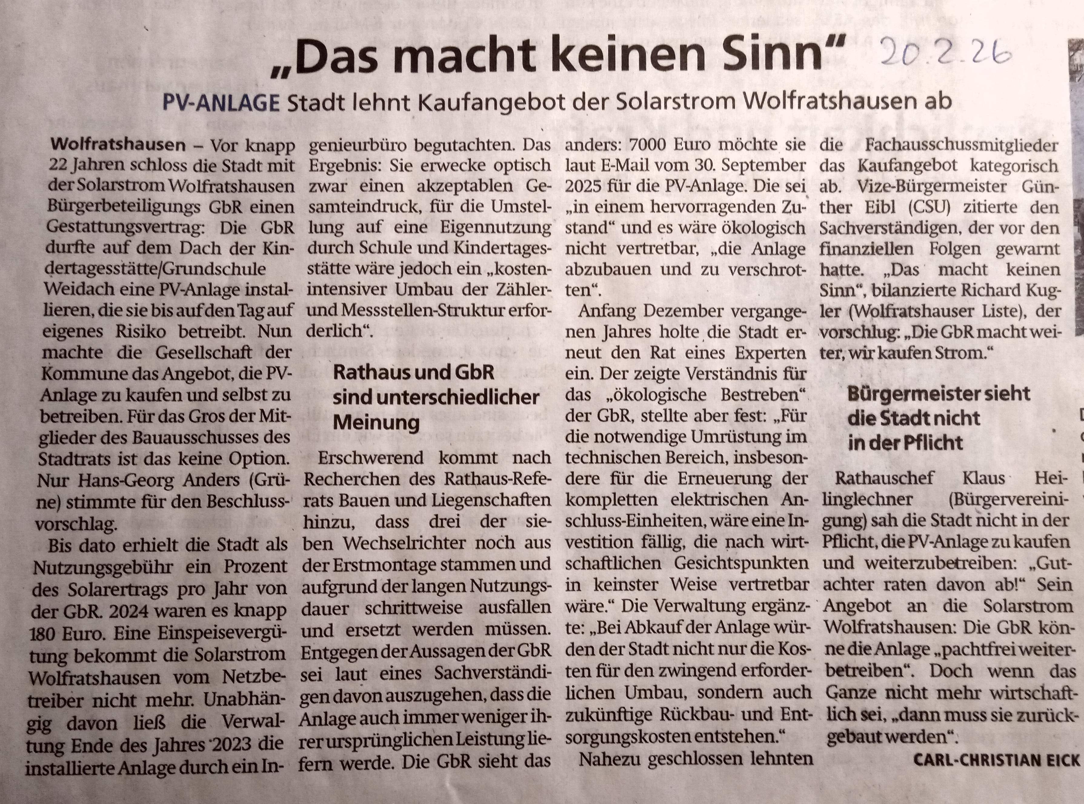 Darüber hinaus ist es nach deren Sichtung dringend angesagt, einen Ortstermin zwischen dem fachkundigen Geschäftsführer der Anlage und dem ortskundigen Elektriker zeitnah anzusetzen. Dies wird Aufschluss darüber geben, ob behauptete fünfstellige Kosten für eine Umrüstung auf Eigenstrombetrieb wirklich anfallen, Zweifel sind berechtigt.